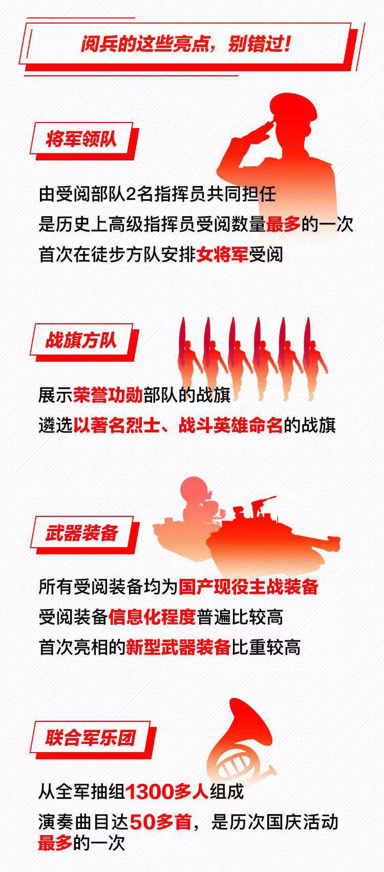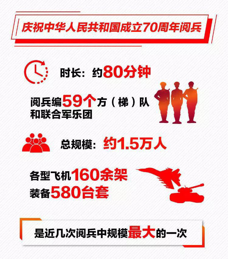 為慶祝新中國成立70周年,10月1日北京天安門廣場將舉行盛大閱兵式。屆時,32個裝備方隊、12個空中梯隊將通過天安門廣場,接受檢閱。此次閱兵,所有受閱裝備均為國產現役主戰裝備,其中包括我軍部分新型裝備,是近幾次閱兵中規模最大的一次。