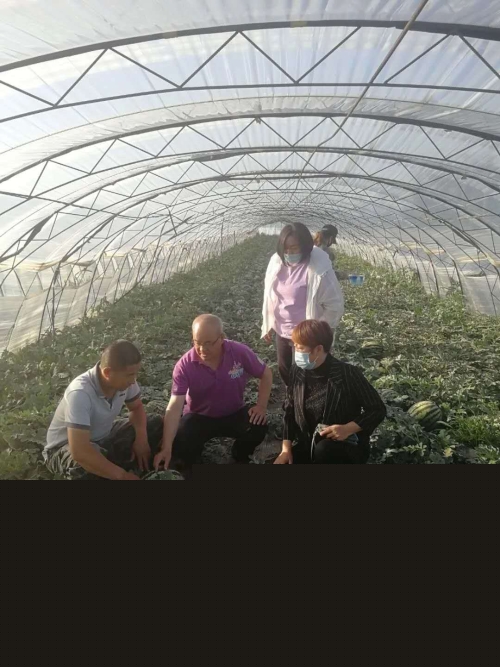 原秀樓(前中)指導村民大棚西瓜管理