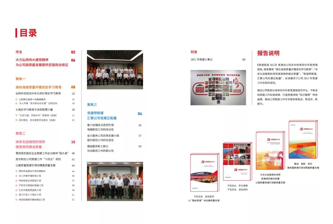 作為奧信公司黨建工作創新成果,《黨建報告2021》聚焦 “高標準高質量開展黨史學習教育”、“體系化加強黨的領導提高黨的建設質量”、“黨建帶群建,匯聚公司發展正能量”,全面展示了公司2021年黨建工作實踐與成效。報告既是奧信公司黨委和16個黨支部、102名共產黨員向上級黨組織交出的一份黨建工作答卷,也是弘揚偉大建黨精神,奮力走好新時代“趕考之路”,以高質量黨建引領保障高質量發展,不斷推動企業做強做優做大的動員令。